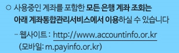 금융결제원은 무료로 배포하고 있고 그것이 계좌통합관리서비스입니다. Account Info 어플입니다. 이걸로 휴면계좌에 대한 조회를 통합조회로 시스템이용으로 할 수 있다고 합니다.