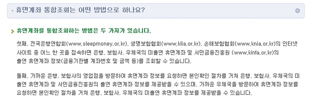 이럴 경우, 본인확인의 절차가 있다고 합니다. 은행과 보험사는 물론이구요. 우체국의 휴면계좌 그리고 또 미소금융중앙재단에서 안나오는 것도 정보를 제공받을 수 있나봅니다.
