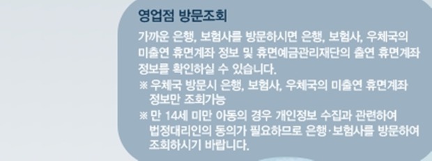 계좌 조회, 잔액의 이전 및 해지, 자동이체 등 가능하죠. 이와 함께 공인인증서가 없거나 인터넷 사용이 어려운 고령층 등을 위해서 은행, 보험사 영업점을 방문하여서 휴면계좌 정보를 요청하면 본인확인 절차를 거쳐 은행, 보험사, 우체국의 미출 연 휴면계좌, 서민금융진흥원의 출연의 휴면계좌 정보를 받을 수 있다고 합니다.