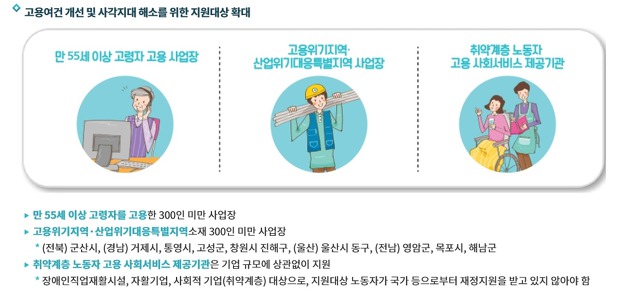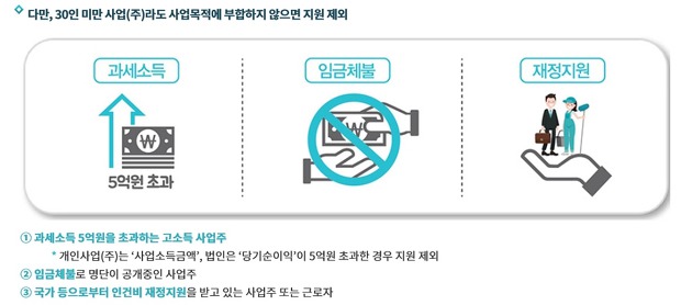 지원금을 받을려면 일단 기준에 맞아야하는데요. 지원 대상을 알아보니, 30인 미만 고용을 하고 있는 사업주입니다. 하지만, 예외로 30인 이상이라도 신청이 가능한 사업이 있습니다.