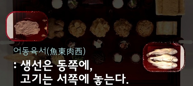 일반적으로 우리가 식사를 할때 랑은 정반대입니다. 살아있는 사람과 반대라는 것 정도만 기억해두세요. 그리고 이어서 2열을 어동육서 그리고 동두서미라고 합니다.