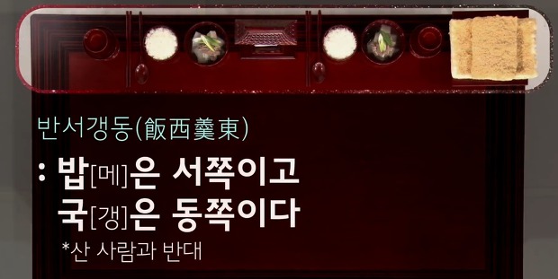 기본적으로 식사류 중에서 밥과 국이 올라간다고 보시면 됩니다. 밥이 서쪽이며, 국은 동쪽이 기본입니다. 여기도 지역차이는 없습니다.