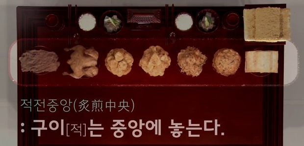 요리가 되는 구이와 전이 올라옵니다. 어동육서의 뜻은 동쪽에 생선이 올라가고, 서쪽에 고기가 올라온다는 뜻입니다. 설날 제사 상 차리는 법에서 많이 보셨을 모습입니다.
