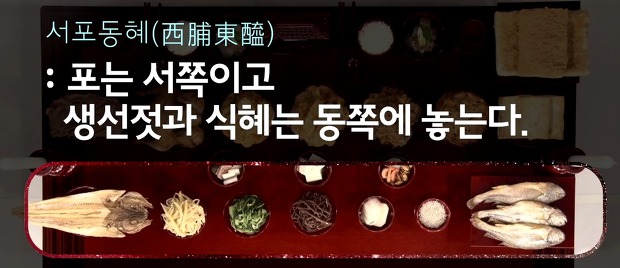 좌포우혜는 포는 서쪽에 둔다는 것이고, 동쪽에는 삭힌음식을 둔다는 겁니다. 여기에 식혜도 올라갑니다. 숙서생동은 바로 서쪽에는 익힌 나물이 올라간다는 것이고 동쪽에 생김치가 올라간다는 겁니다.