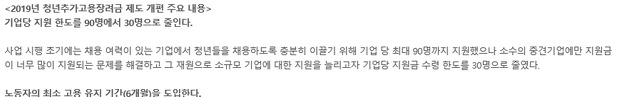 청년에 추가고용을 위한 장려금 대상이 조금 강화되었습니다. 내용은 기존 최대 90명까지 지원했었던 지원 한도를 30명으로 줄였습니다. 1/3로 줄여버렸구요.