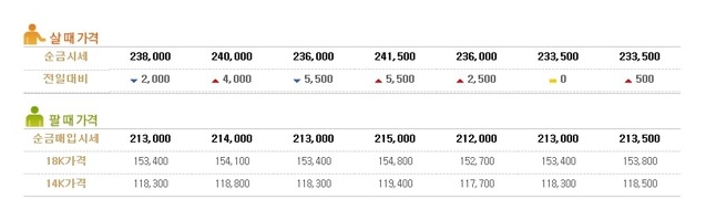 오늘 금시세24K 1돈을 보면 가격이 내가 살때 기준으로 238천원입니다. 그리고 내가 팔때를 보면 213천원입니다. 18k 는 제품시세적용이라고 보입니다. 팔때는 1534백원으로 나오네요. 이렇게 그날 그날 알수가 있죠 은이나 백금 14k도 같아요.