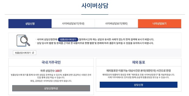 하지만, 전화상담은 방문보다는 자세히 알기 어렵다는 점 미리 말씀드리구요. 사이버상담은 접근성은 좋지만, 하루에 딱 100번만 받는 시스템입니다. 일찍 일어나서 올리는 것이 좋겠죠?