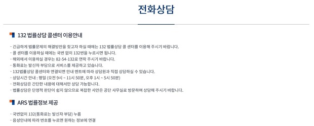 정말 필요한 분들을 위해서 이런 짓을 하면 안되겠죠? 그리고 무료로 상담받기 위해 방문을 하기엔 너무 시간적으로 부족하다면, 132 법률상담 콜센터를 이용하세요. 이용시간은 오전 9~11시50분까지 가능하고 오후시간은 1~5:50분까지 가능합니다.