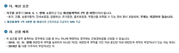 이제 근로 장려금 신청방법 중에서 재산은 어느정도 여야하는지 알아보겠습니다. 지원하는 시점을 기준으로 해서 가구원 재산을 합산해보구요. 이것이 2억원이 넘어가면 안됩니다. 여기서 재산이란 건물이나 아파트 자동차 예금 전세돈 전부 해당이 되구요. 부채도 포함으로 계산이 됩니다.