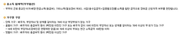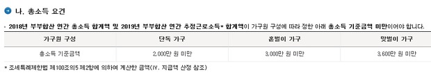 배우자, 18세 미만 부양자녀, 70세 이상 부모 등등 요건이 아주 많습니다. 전부 해당해야하는 것은 아니구요. 이런 경우와 배우자의 총급여가 300만원 미만인 홀벌이 가구도 들어갑니다.