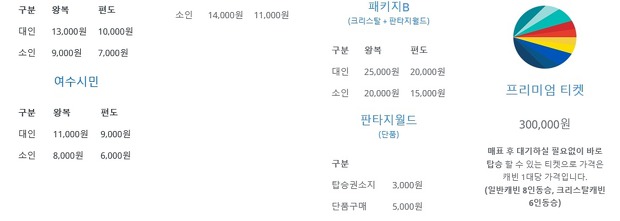 또, 장애인 및 동반 보호자 1인은 할인이 가능합니다. 위 요금 외에도 판타지월드 미디어아트 뮤지엄 패키지, 프리미엄 티켓 등이 있습니다. 프리미엄 티켓같은 경우엔 매표 후 대기할 필요없이 바로 탈 수 있는 혜택이 있습니다. 이런 경우는 캐빈 1대당 가격이 30만원입니다. 비싸죠?